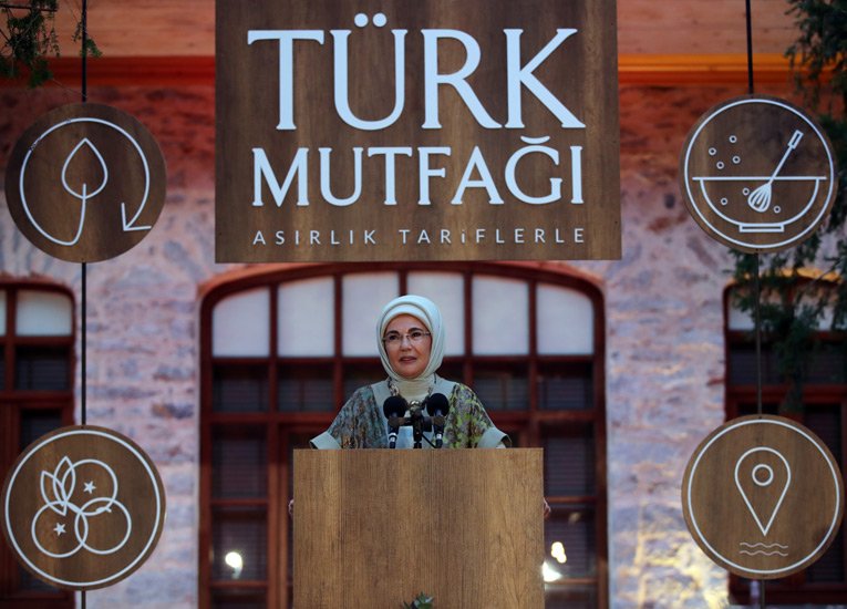 Emine Erdoğan, Türk mutfağının diğer ülke mutfakları arasında çok ayrı bir yeri olduğunu ancak bu şöhretin sadece birkaç çeşit yemekle sınırlı kalırsa Türk mutfağının asırlarla ölçülen tarihine büyük haksızlık olacağını düşündüğünü dile getirdi. Türk aşçılarının başarılarının dünyaya mal olduğunu hatırlatan Emine Erdoğan, dünyanın en önemli gastronomi yarışmalarında şampiyonluk elde etmiş gastronomi yıldızları olduğuna, Türk aşçılarının açtığı restoranlardan “Dünyanın en iyi 50 restoranı” listesine girenler bulunduğuna, “Michelin yıldızı” ve bu alanda dünyanın önde gelen ödüllerini almış aşçılar olduğuna dikkati çekti. Gaziantep, Hatay ve Afyonkarahisar’ın, “UNESCO Yaratıcı Şehirler Ağı” içerisinde bulunduğunu, abugannuş, oruk, künefe, lokum, kaymak, sucuk ve pöçün UNESCO tarafından koruma altına alınan Türk yemekleri olduğunu aktaran Erdoğan, Türk mutfağını “daha nice büyük keşiflerin yapılabileceği bir derya” olarak niteledi.