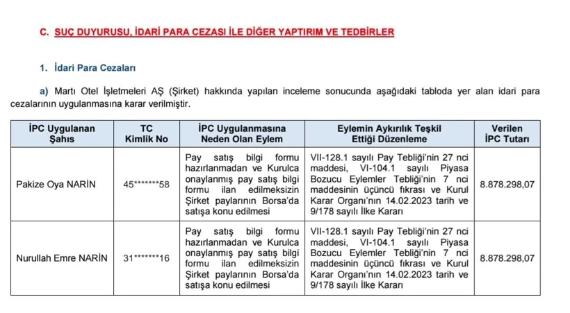 Sermaye Piyasası Kurulu, Martı Hotels Yönetim Kurulu Başkanı Oya Narin ve ağabeyi Nurullah Emre Narin’i, pay satış formu hazırlamadan ve Kurul onayı olmadan Borsa’da işlem yapmaları nedeniyle 8 milyon 878 bin TL idari para cezasına çarptırdı.