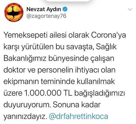 Yemeksepeti Kurucusu Nevzat Aydın, Koronavirüsle mücadelede tüm Türkiye’nin alkışladığı canımızı ve sevdiklerimizi emanet ettiğimiz, tüm zorluklara rağmen görevlerini fedakarca yerine getiren sağlık çalışanlarımıza destek verdiğini sosyal medya hesabından yaptığı açıklamada duyurdu. Yemeksepeti üst yöneticisi Nevzat Aydın yaptığı açıklamada, ”Yemeksepeti ailesi olarak Corona’ya karşı yürütülen bu savaşta, Sağlık Bakanlığımız çalışan doktor ve personelin ihtiyacı olan ekipmanın temininde kullanılmak üzere 1.000.000 TL bağışladığımızı duyuruyorum. Sonuna kadar yanınızdayız.” ifadelerini kullandı.