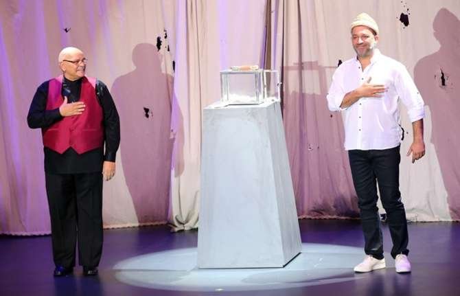 Oyuncu Rasim Öztekin, Kel Hasan Efendi’nin kavuğunu, oyuncu Şevket Çoruh’a teslim etti.